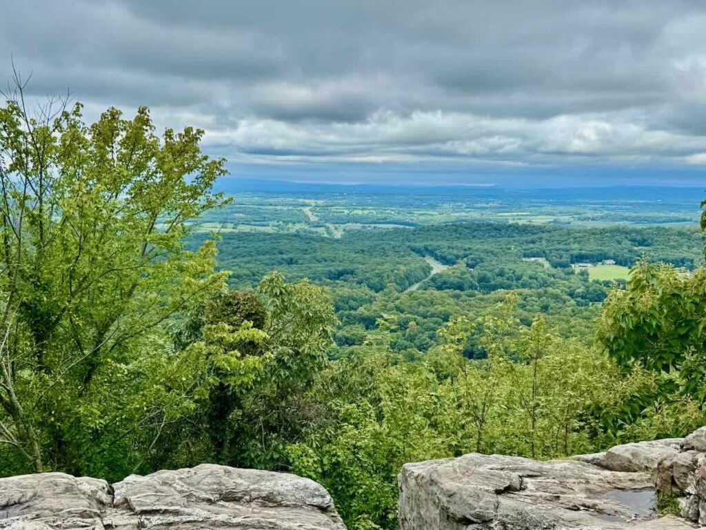 Bears Den Overlook is a rocky outcropping on the Appalachian Trail in Bluemont, Virginia. The open ledge scattered with large boulders offers beautiful panoramic views of the Shenandoah Valley to the west. In the distance, the Blue Ridge Mountains stretch across the horizon. The beautiful setting and easy access make Bear’s Den one of the best places to enjoy a short hike on the Appalachian Trail near DC.